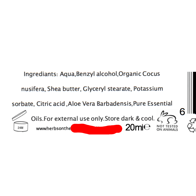 aqua, caprylic/capric triglyceride(from coconut oil & glycerin), glyceryl stearate (emuslsifier from soya beans) , peg 100 stearate, phenoxyethanol (gentle non irritating preservative), cocoa butter(organic),shea butter, benzyl alcohol.tocopherol acetate (vit e), safflower, jojoba, potassium sorbate (natural preservative), aloe barbadensis (aloe vera), glycerin, citric acid, Pure Rosemary & Peppermint Essential Oil.