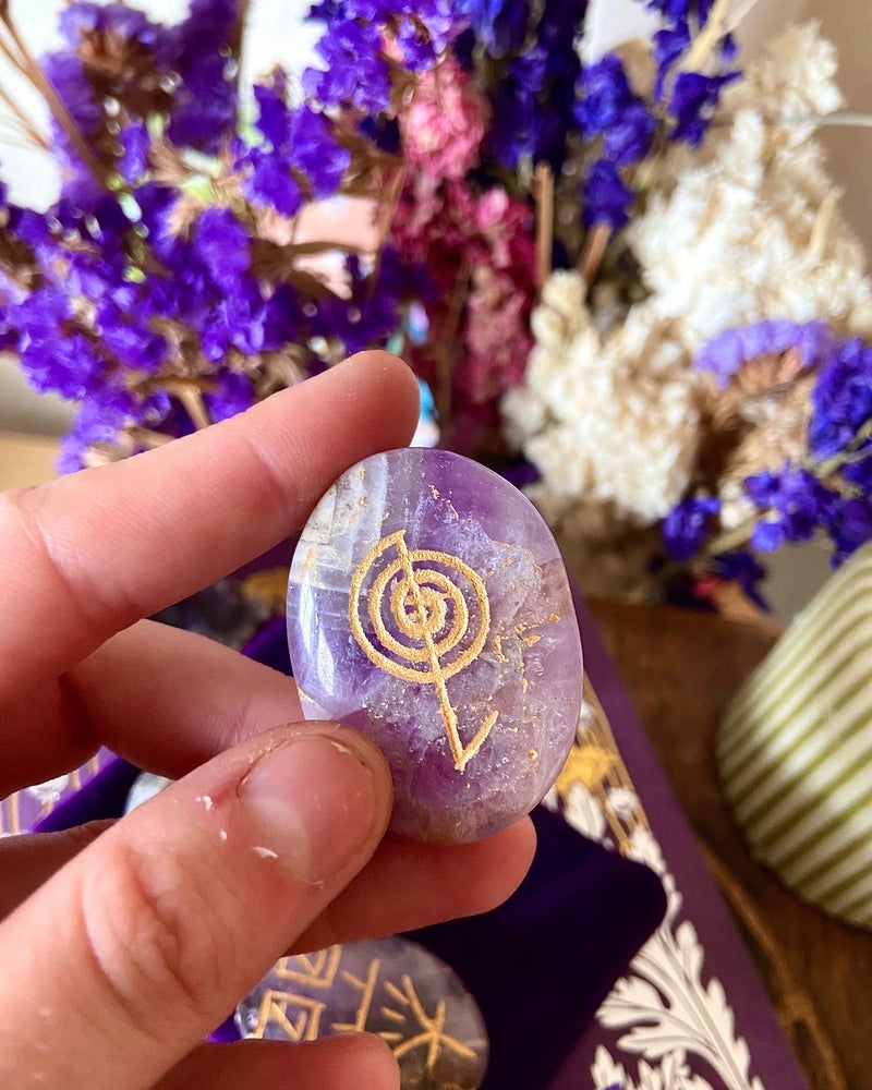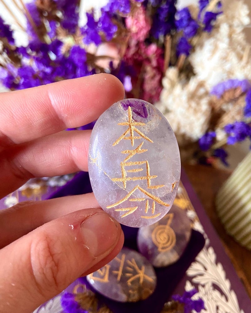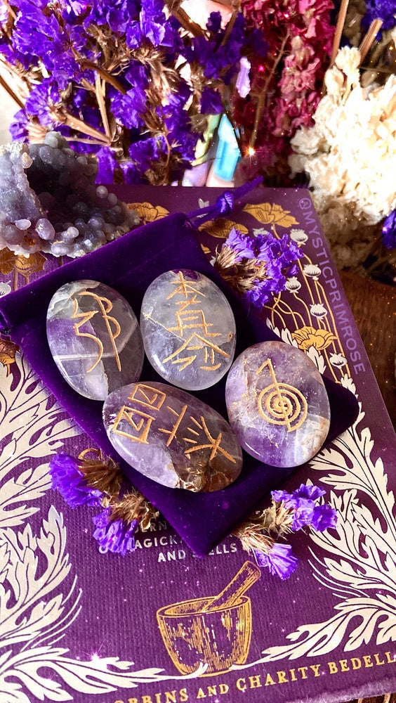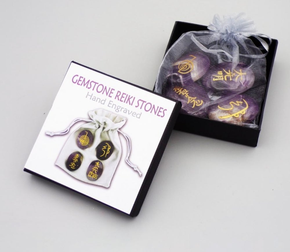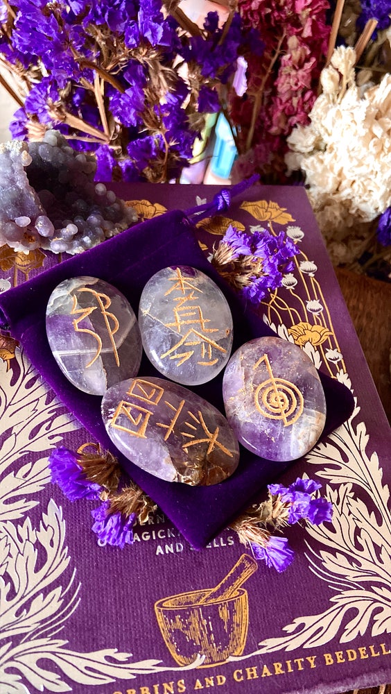 set of four amethyst flat stones with the four reiki symbols engraved on individually. The power symbol, mental/emotional, distant healing and reiki master are all used. The set comes in a gift presentation box and with a satin pouch, also with info on the rear.