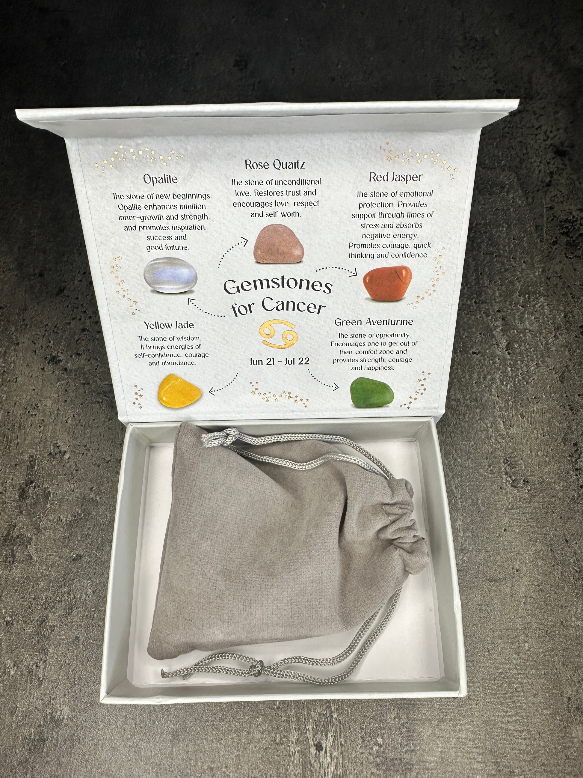 Celebrate the compassionate, sensitive, and loving nature of Cancer with this stunning set of five crystal tumblestones. Each crystal has been carefully selected to support Cancer energy: Rose Quartz for unconditional love, Moonstone for new beginnings, Red Jasper for protection, Yellow Jade for wisdom, and Green Aventurine for opportunity. Presented in a sleek magnetic closure gift box with an information card detailing each crystal’s meaning, along with a velvet drawstring bag to keep them safe, this set is both a thoughtful gift and a powerful personal talisman.
