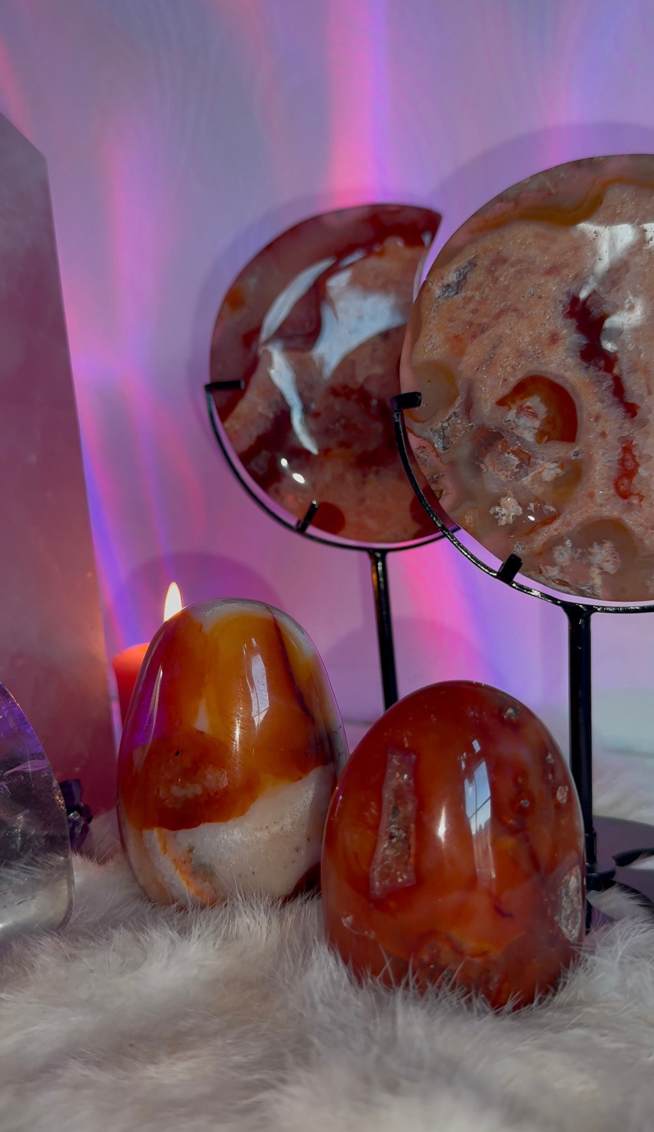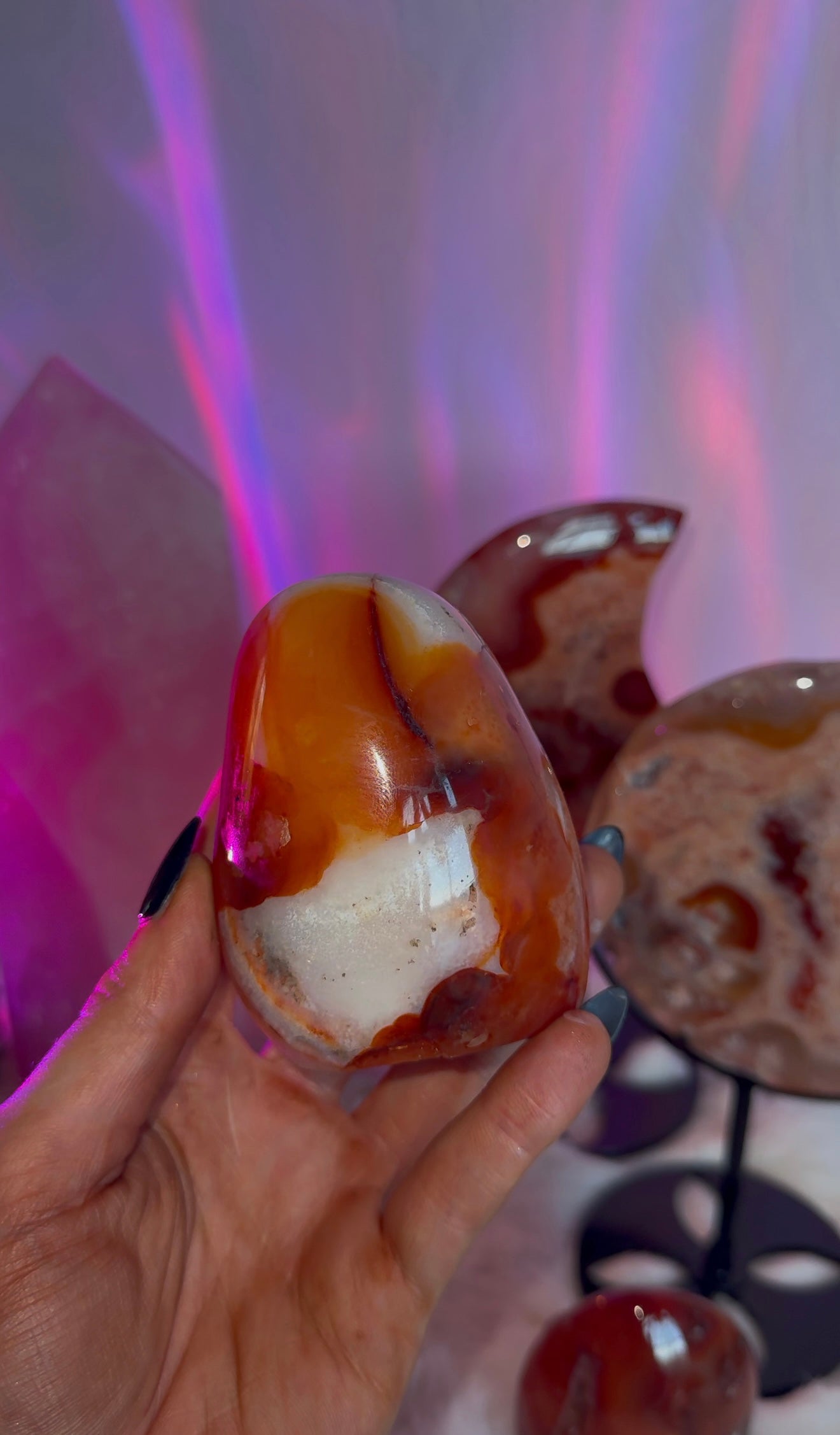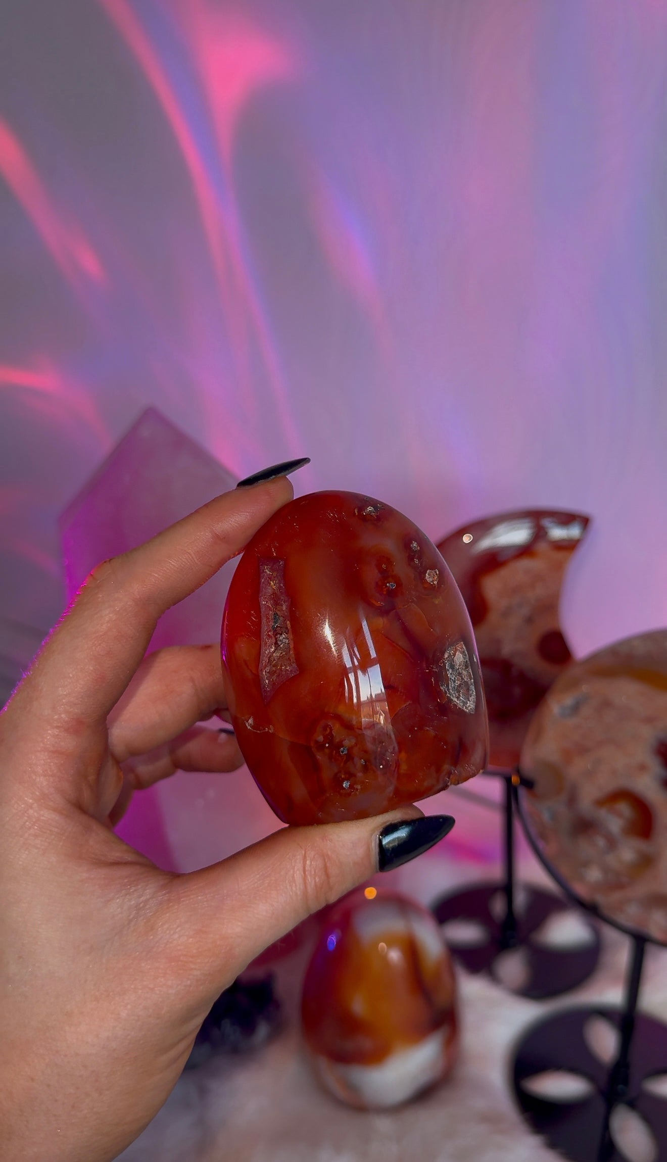 Add a touch of spirituality to your decor with my Carnelian Freeforms. These unique pieces not only add a pop of color to any space, but also serve as a reminder of the healing and protective properties of Carnelian. A playful and meaningful addition to your home.