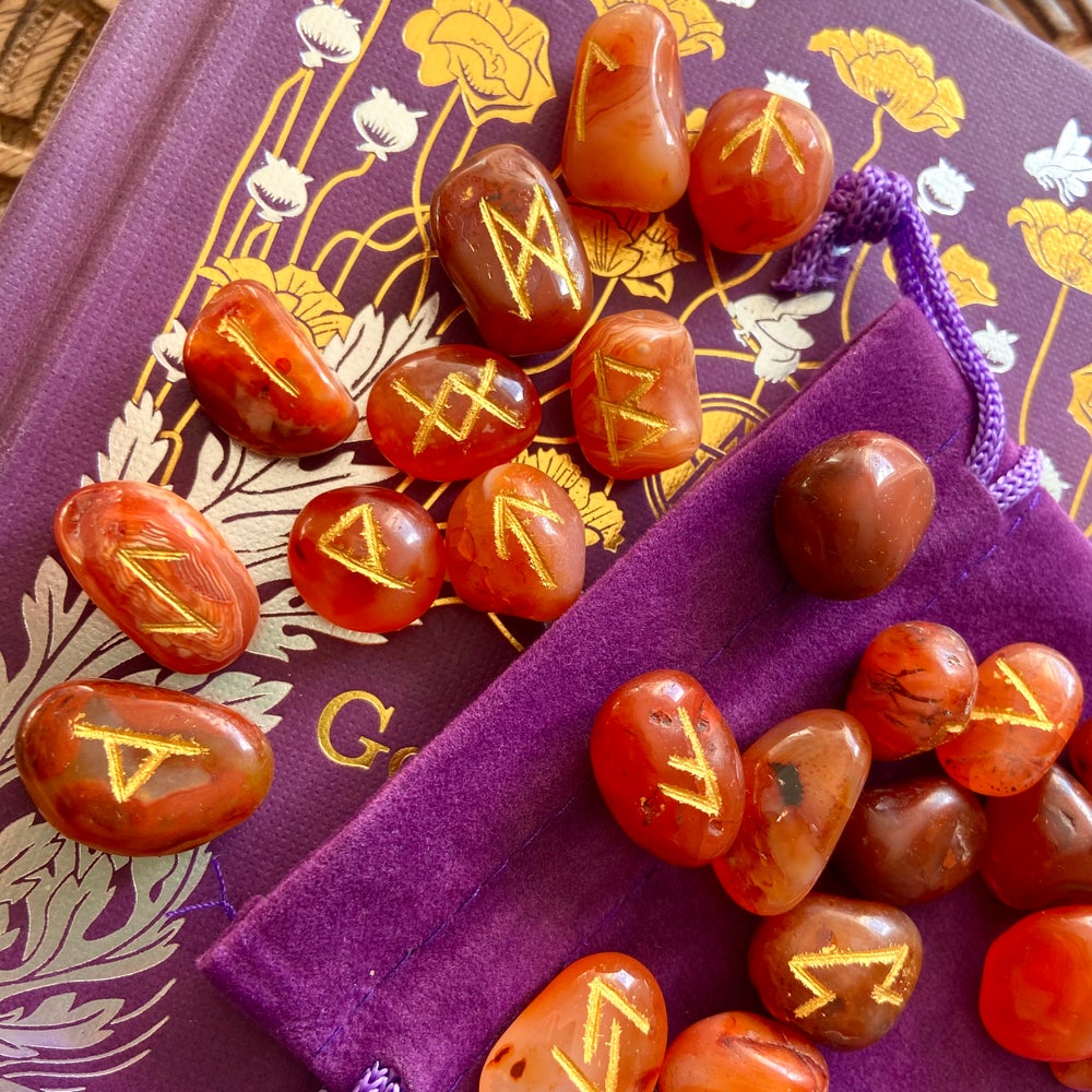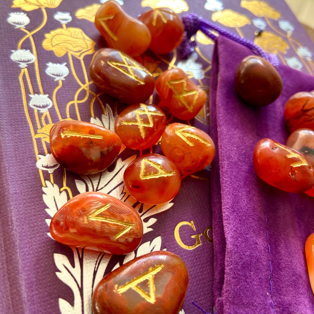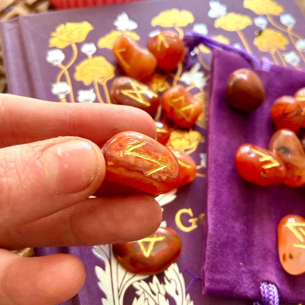 Beautiful carnelian elder futhark runes with black velvet pouch and instruction guide ✨🔮