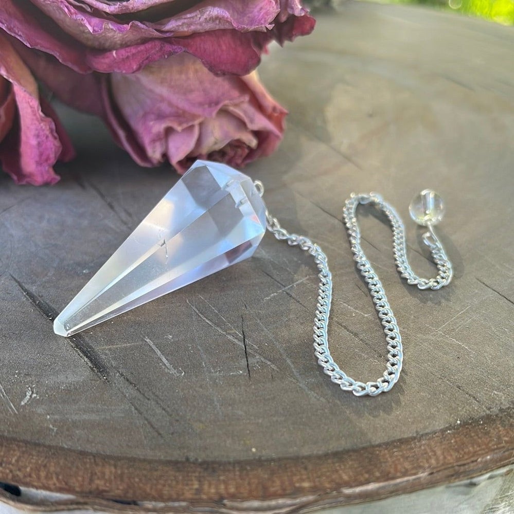 Beautiful natural Brazilian clear quartz crystal cone dowsing pendulum on a plated brass chain.