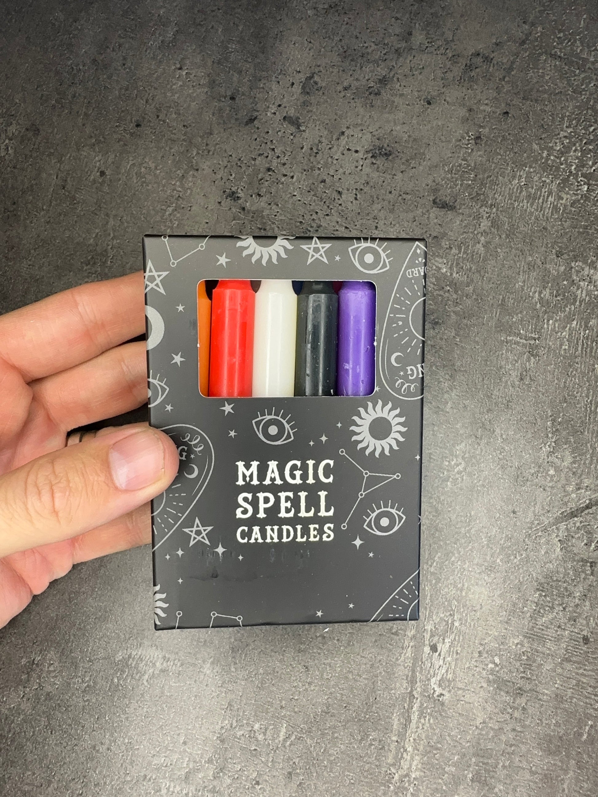 This set of 12 mixed spell candles is perfect for a variety of rituals, intention setting, and spiritual practices. The pack includes a vibrant range of colours - 2x black, 2x white, 1x purple, 1x dark blue, 1x light blue, 1x orange, 1x green, 1x red, 1x yellow, and 1x pink - allowing you to choose the right shade for your desired focus. Crafted from paraffin wax, these candles are ideal for use in spellwork, meditation, or altar displays.