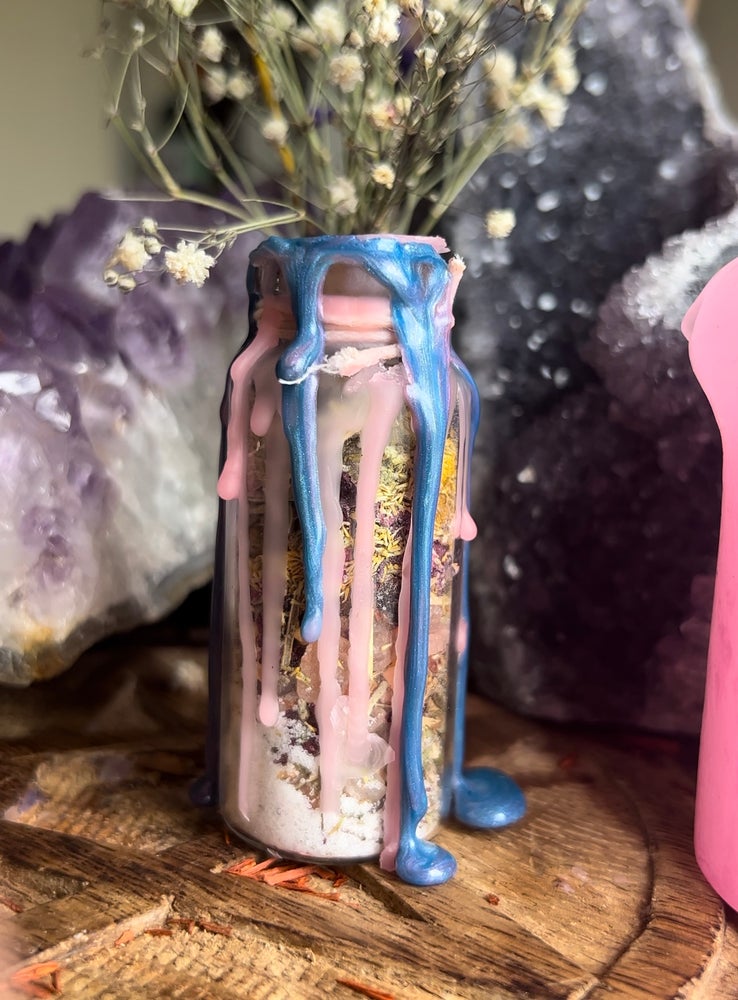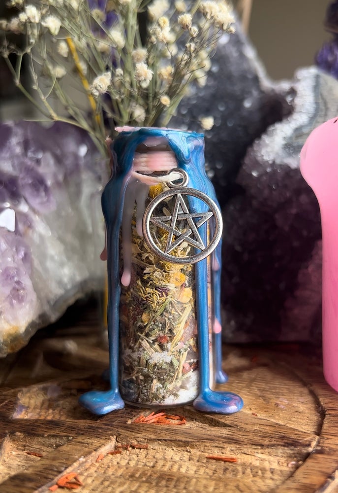 Charmed with the protective power of a variety of herbs and minerals, this Pet Protection Spell Bottle will help to dispel negative energies and deflect psychic attack from your beloved companion.