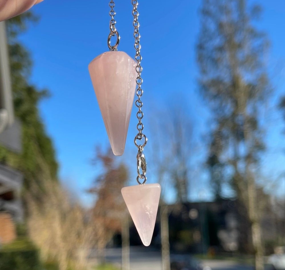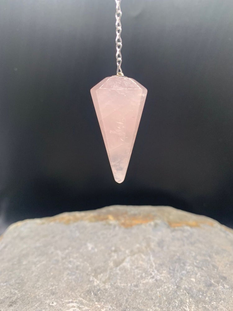 Beautiful natural Rose Quartz crystal cone dowsing pendulum on a plated brass chain.